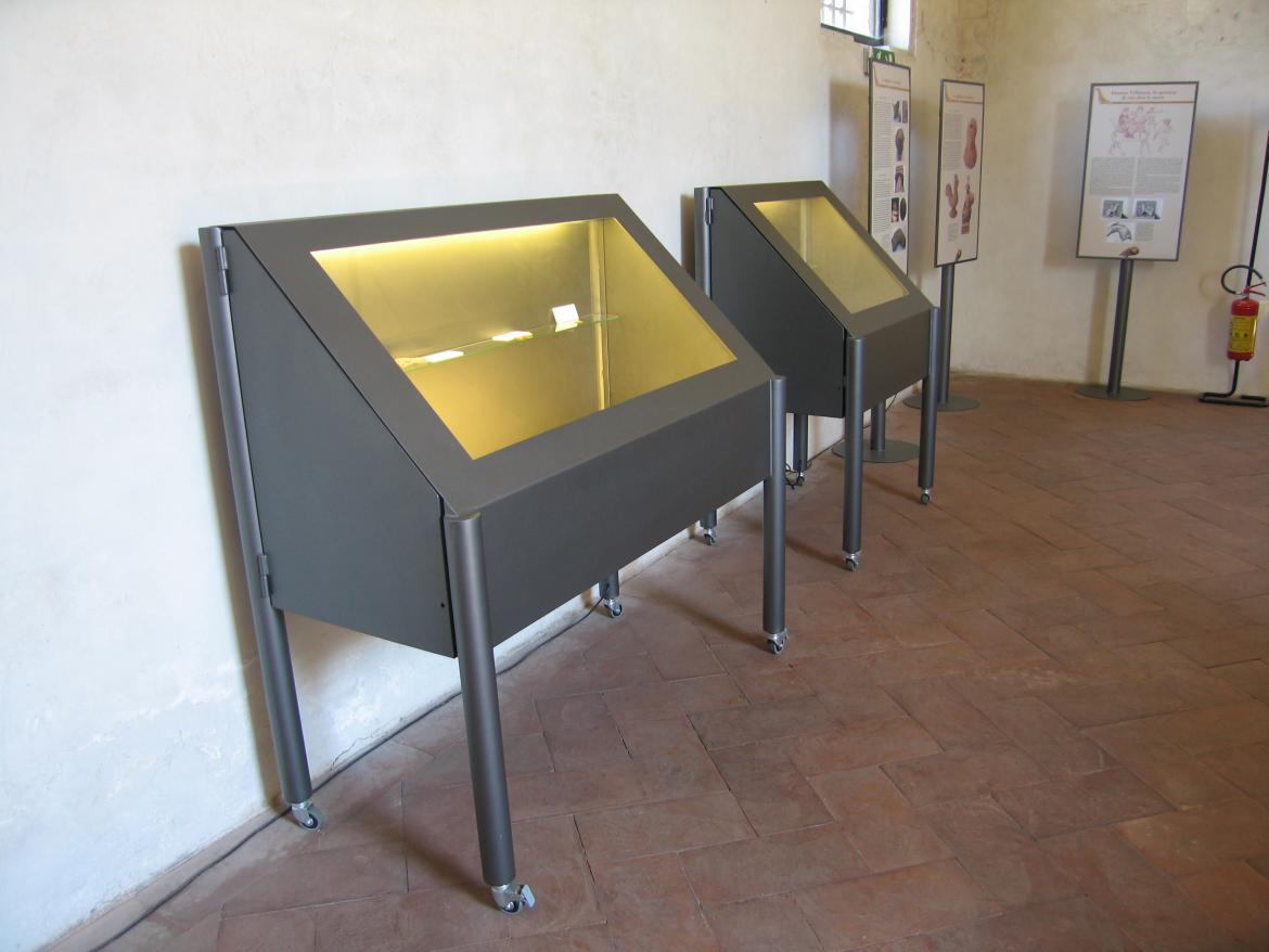 Nelle ampie scuderie del castello e nelle stanze adiacenti, viene progettato un allestimento essenziale e sobrio, che punta a non competere con l’architettura ma ricava delle isole espositive inserite nella geometria dello spazio.