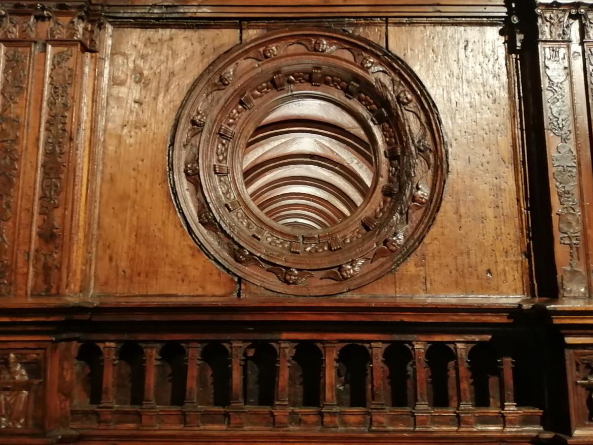 Realizzazione di un grande basamento che connette il grande modello Rinascimentale al piano (precedentemente cavalletti in ferro, conservati e inglobati nella struttura), con la funzione di proteggere l'opera e di ospitare un impianto di illuminazione interna che permette al visitatore di leggere il magnifico intaglio delle campate.