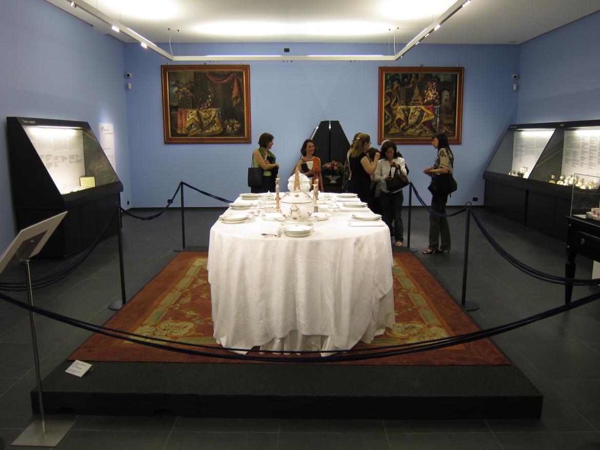 Senza negare questo ruolo nella storia dell'arte, la mostra restituisce al ricco servizio la sua funzione legata tanto alla vita quotidiana quanto ai rituali di costume della classe dominante dell'epoca.